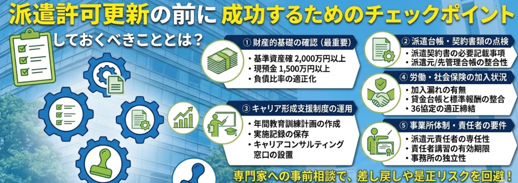 派遣更新は単なる書類提出ではなく、会社の総点検の機会です。財務、労務管理、契約管理、教育体制など、派遣事業者としての適正性が総合的に審査されます。