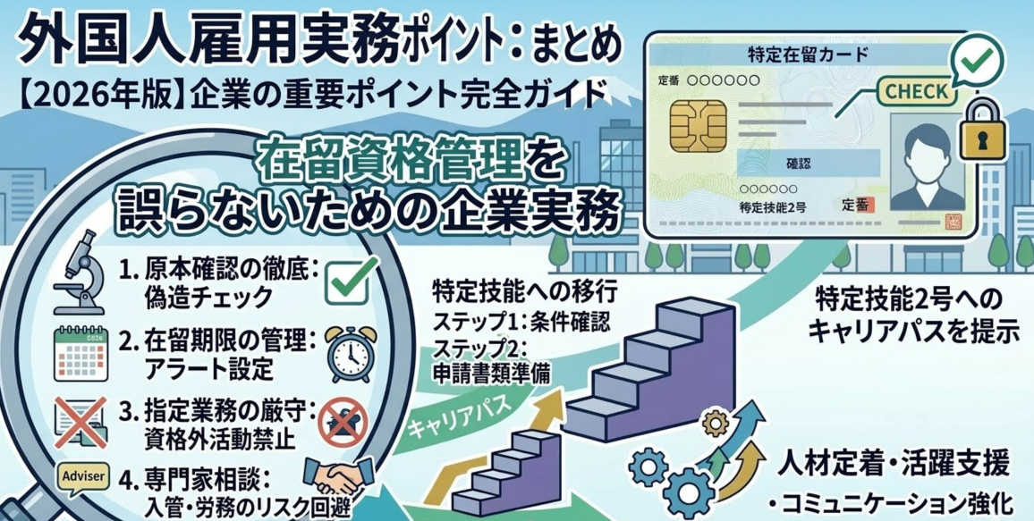 企業は外国人雇用を短期的な人手不足対策としてではなく、中長期的な経営戦略として位置づけることが必要です。適正な在留資格管理と労務管理を実践することで、外国人材の能力を最大限に活かし、企業の発展につなげることができるでしょう。