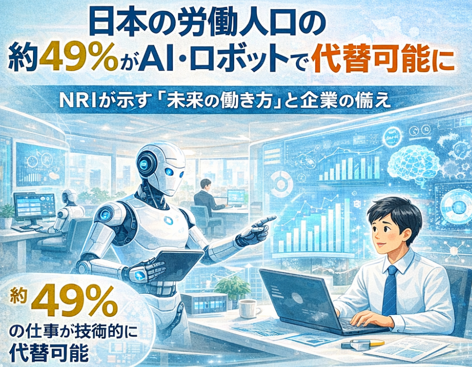 NRIの推計によると、日本の労働人口の約49%の仕事が技術的にはAIやロボット等に代替可能とされています。